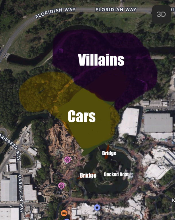 Reroute or tunnels. The borders aren’t exact. I just think they will place most of Cars where the lagoon is now, and Villains behind it and Mansion.So what happens to the railroad under this scenario?