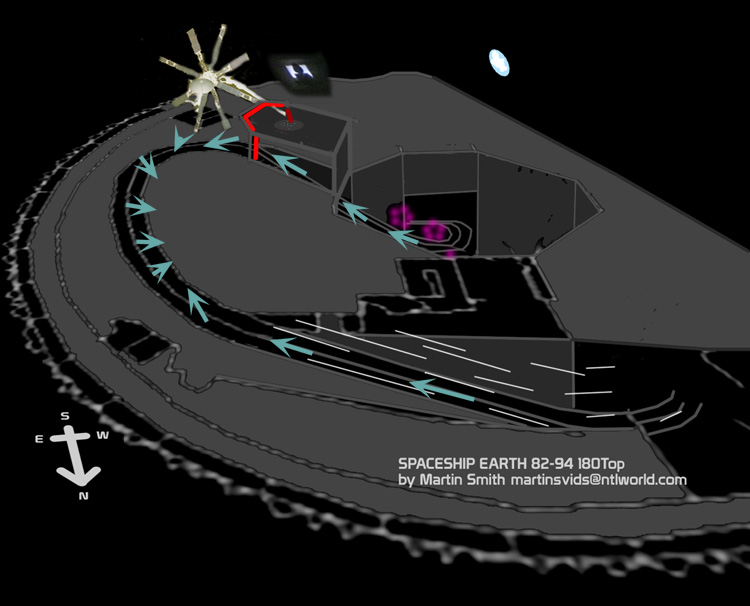 As well as the satellite and astronaut there was also a form - as in a shape in the darkness - of a space station. The station had a window in it which had a girl looking out, hands on glass, watching the work on the satellite. It was this `station` that the ride passed under and into backwards, and it was also the structure that held the red strips of light and dome above the track as the descent began.