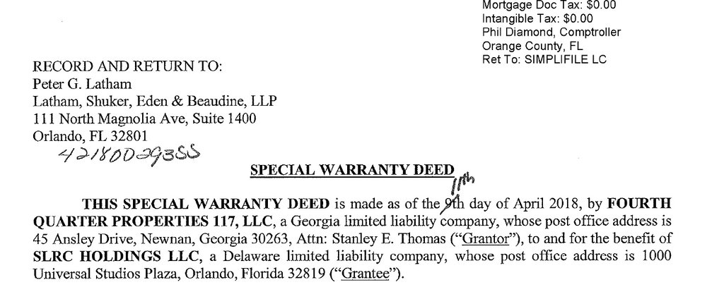The 1,800 acres were sold to Georgia developer Stan Thomas for $70 million, but Universal ensured it wouldn’t be facing any competition by placing a deed on the property banning large-scale amusement uses, including theme parks. Before selling the property, Universal had submitted plans to Orange County for a third theme park, 2 18-hole golf courses, 2 million square feet of retail, and more than 10,000 hotel and timeshare units.