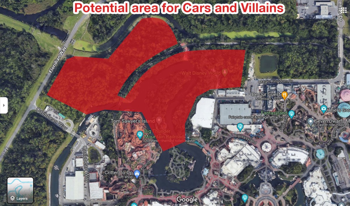 I don't think either of these are a good fit for Magic Kingdom, but if they remove the river they can easily run the cars under the train bridge, and would have a lot of space for both Cars Land and Villains Land